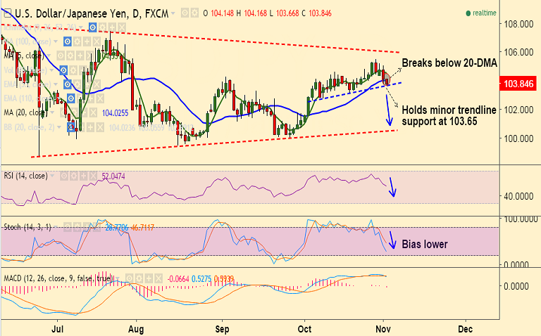 - On the daily charts the pair has broken below 20-DMA at 104.02, intraday bias lower.