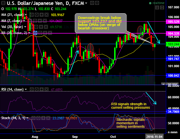 The downswings break below support 103.237 and slid below DMAs (on verge of bearish crossover), after rejecting stiff resistances of 105.532 and 104.328 levels, failure swings have evidenced slumps to resume bears in the major trend.