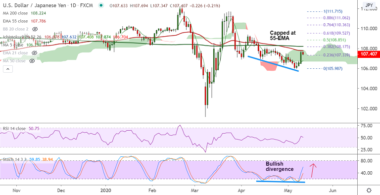 Price action has broken above 21-EMA, but is struggling at 55-EMA which is offering stiff resistance at 107.78.