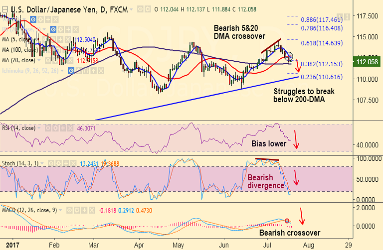 - The major has retraced brief dip below 200-DMA which is strong support at 111.71.