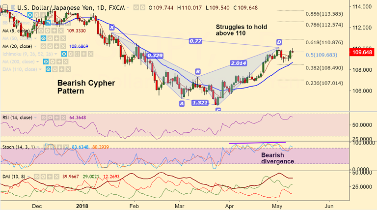 - That said, bearish divergence and 'Cypher Pattern' on daily charts keeps scope for downside.
