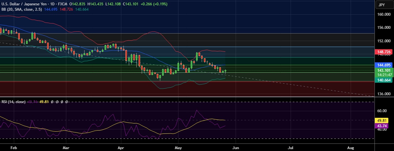• Support is seen at 142.45(38.2%fib) and break below could take the pair towards 140.80 (Lower BB ).