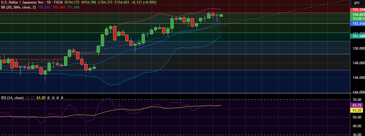 • Immediate resistance is located at 154.89(23.6%fib), any close above will push the pair towards 155.33 (Higher BB).