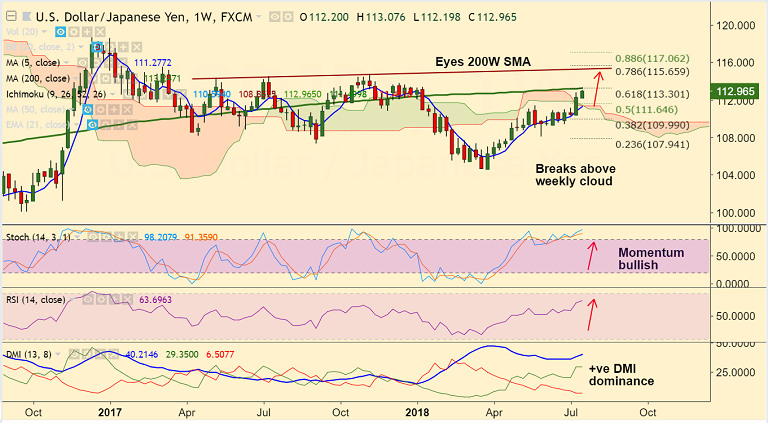 - Price finds immediate strong resistance at 200W SMA at 113.24. Break above targets 78.6% Fib at 115.65.