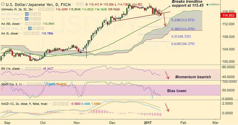 - USD/JPY has broken major trendline support at 115.45, upside remain capped by 5-DMA at 115.77.