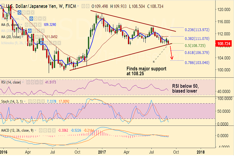 - Intraday bias in the pair bearish. We see scope for test of major trendline support at 108.25 on weekly charts.
