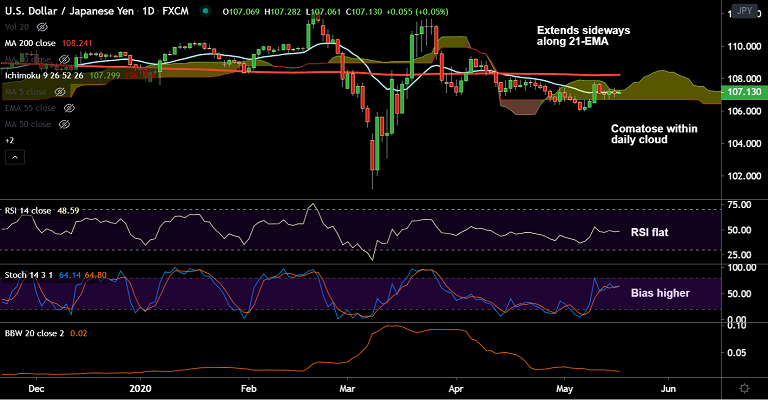 Price action is extending sideways along 21-EMA and holding above Tenkan Sen. Breakout above daily cloud will support gains till 200-DMA (108.24).