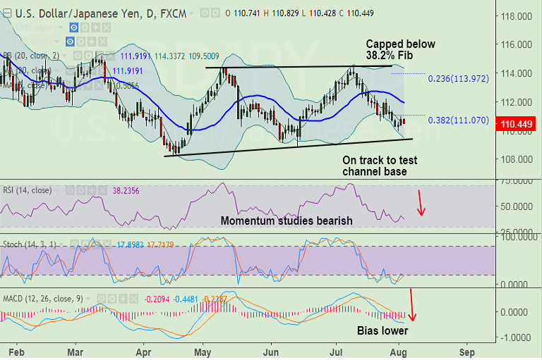- Momentum studies remain bearish, scope for test of channel base at 109.45.