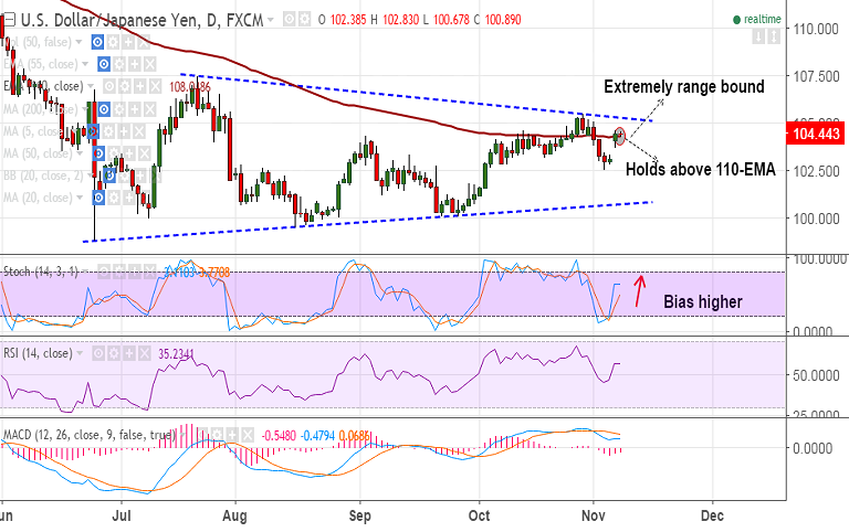 - Major support levels - 104.26 (110-EMA), 104.05 (20-DMA), 103.65 (5-DMA), 103, 102.55 (Nov 3rd low)