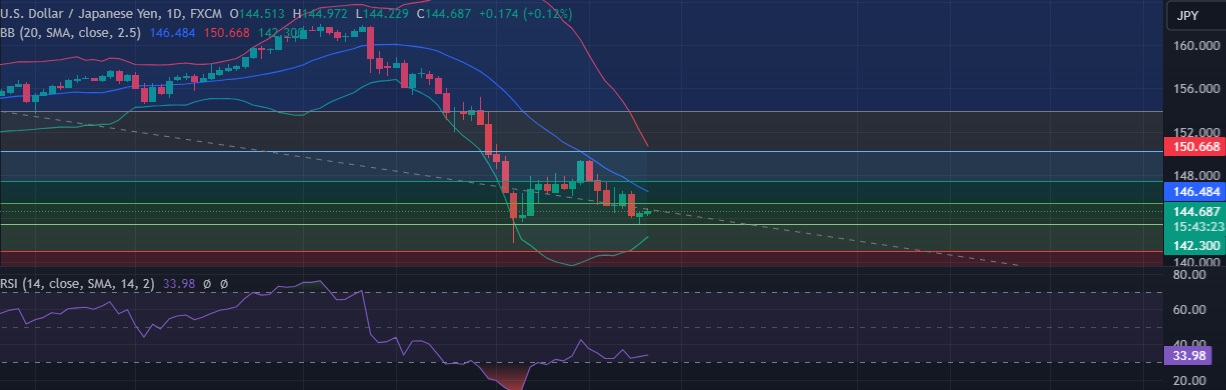 • Support is seen at 143.50 (38.2%fib) and break below could take the pair towards 142.39 (Lower BB)
