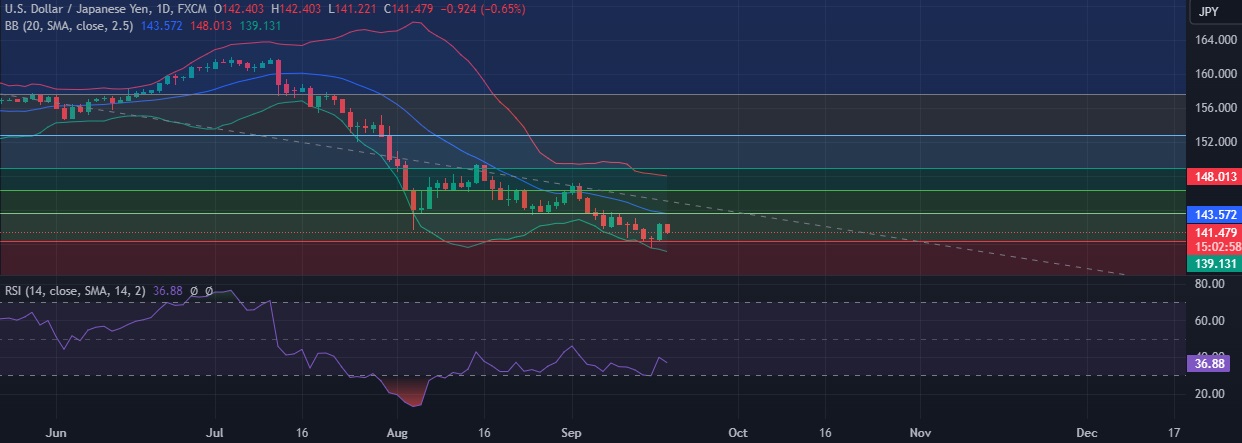 • Support is seen at 140.22 (23.6%fib) and break below could take the pair towards 139.23(Lower BB).
