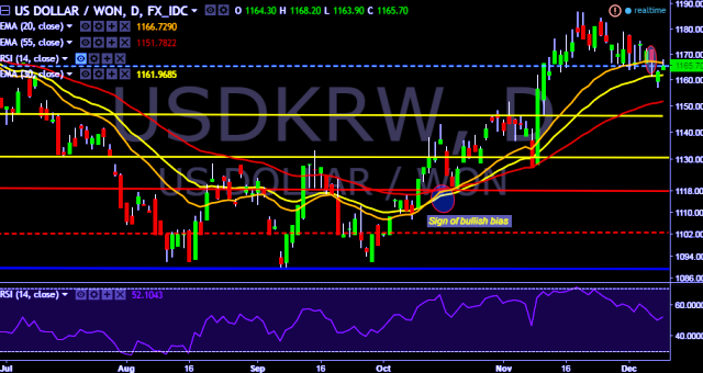 We prefer to take long position in USD/KRW only above 1,168, stop loss at 1,157 and target of 1,178/1,187.