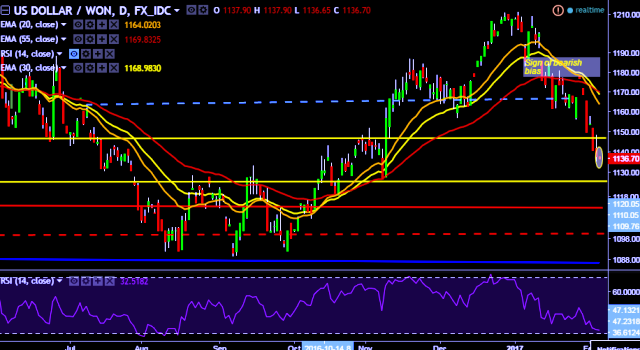 We prefer to take short position in USD/KRW around 1,137, stop loss 1,148 and target of 1,124.