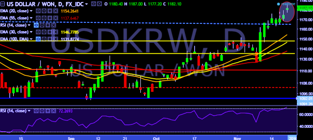We prefer to go long on USD/KRW around 1,178, stop loss 1,162 and target 1,196/1,209.