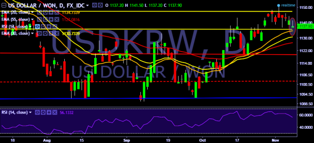 We prefer to go long on USD/KRW around 1,135, stop loss 1,127 and target 1,152/1,162.