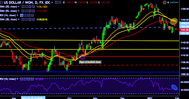 We prefer to take short position in USD/KRW around 1,162, stop loss 1,172 and target of 1,142.