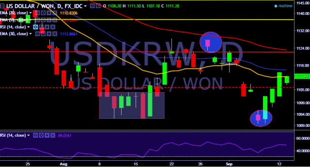 We prefer to go long on USD/KRW only above 1,112 with stop loss at 1,102 and target of 1,125/1,142.