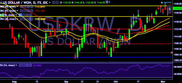 We prefer to go long on USD/KRW around 1,140, stop loss 1,136 and target 1,152/1,162.