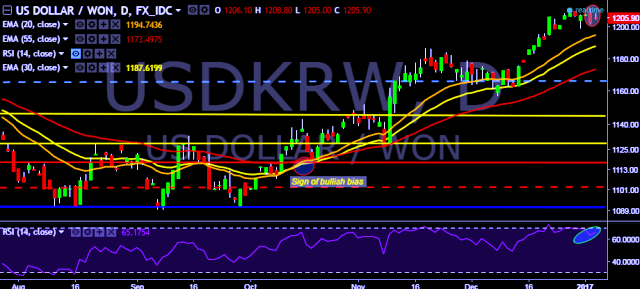 We prefer to go long on USD/KRW only above 1,208 with stop loss at 1,198 and target of 1,220.