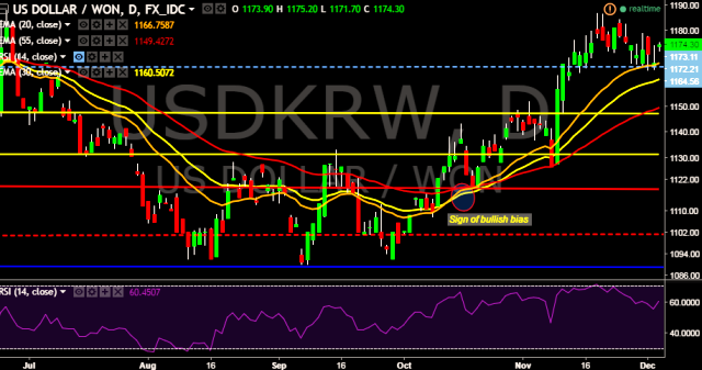 We prefer to take long position in USD/KRW around 1,172, stop loss at 1,164 and target of 1,187/1,196.