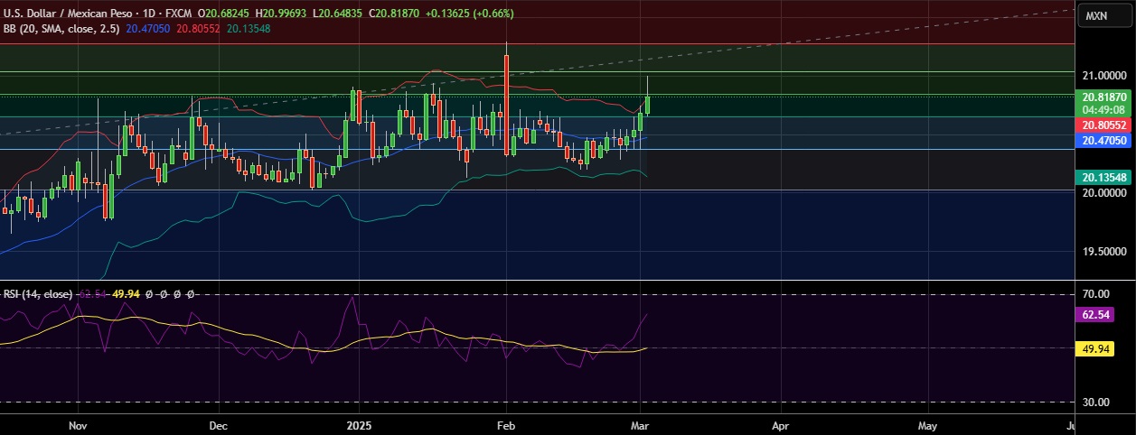 • USD/MXN strengthened on Tuesday as investors assessed the impact of Trump’s new trade tariffs on Mexico, Canada, and China, escalating global trade tensions.