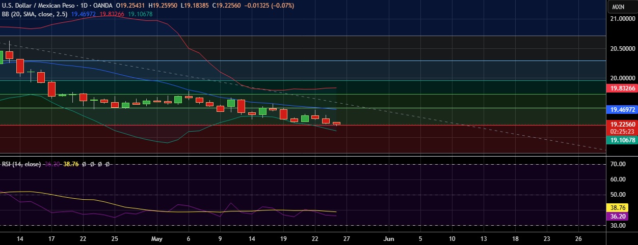 • USD/MXN dipped on Monday as Trump’s policy reversals and a massive spending and tax-cut bill dampened demand for U.S. dollars.