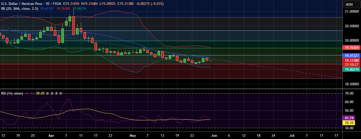 • Support is seen at 19.184 (23.6%fib) and break below could take the pair towards 19.056(Lower BB).