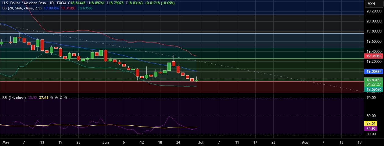 • Support is seen at 18.808(23.6%fib) and break below could take the pair towards 18.700(Lower BB).