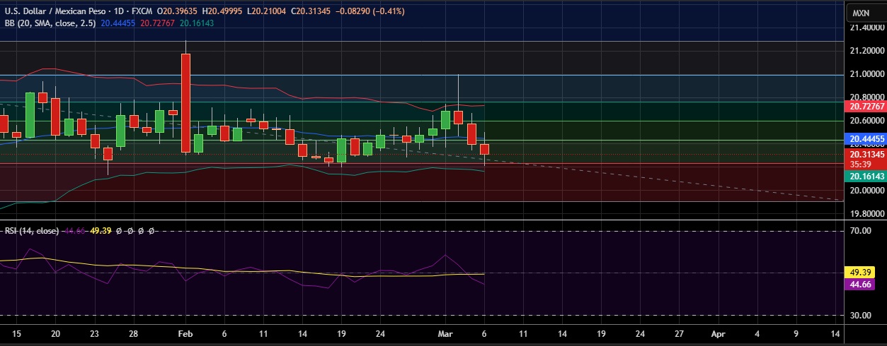 • At GMT 21:22, the dollar was down 0.50% against the dollar Mexico's peso at 20.314