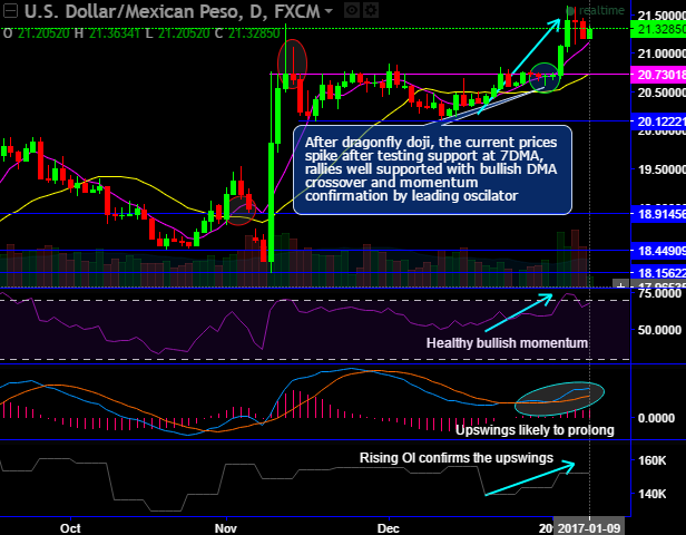 After dragonfly doji, the current prices spike after testing support at 7DMA, rallies well supported with bullish DMA crossover and momentum confirmation by leading oscillator.