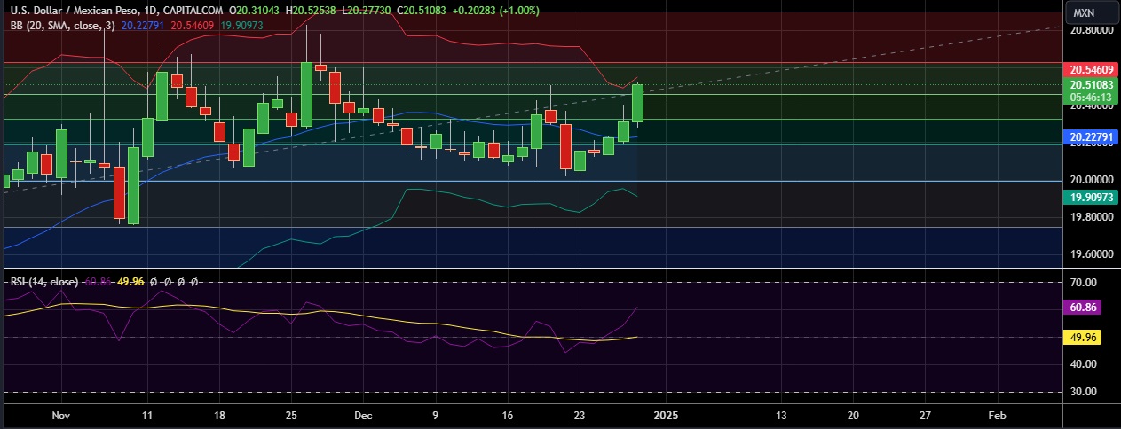 • USD/MXN rose towards level 20.500 on Monday as traders continued to digest the likelihood that the Federal Reserve will make fewer rate cuts next year.