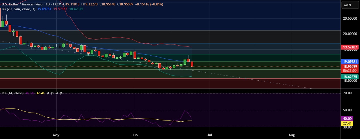 • USD/MXN slipped sharply lower on Tuesday as the dollar extended its pullback, with markets finding relief in the Israel-Iran ceasefire.
