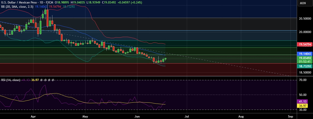 • Support is seen at 18.828(23.6%fib) and break below could take the pair towards 18.737(Lower BB).