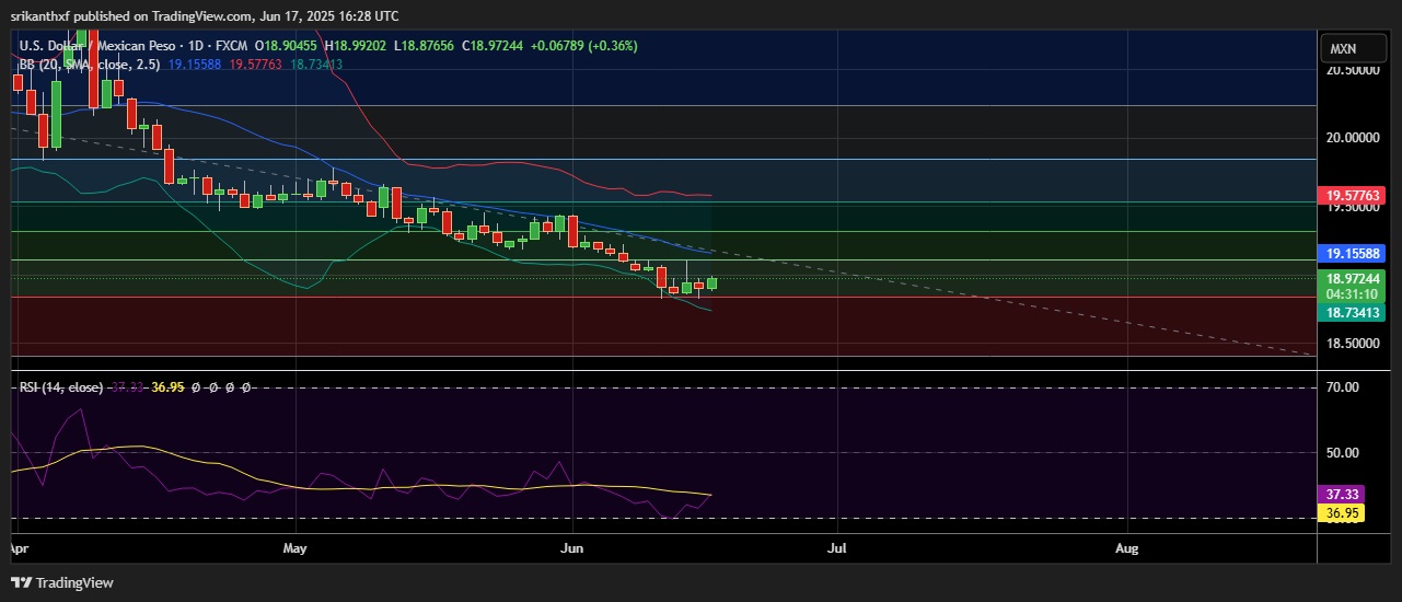 • Support is seen at 18.837 (23.6%fib) and break below could take the pair towards 18.740(Lower BB).