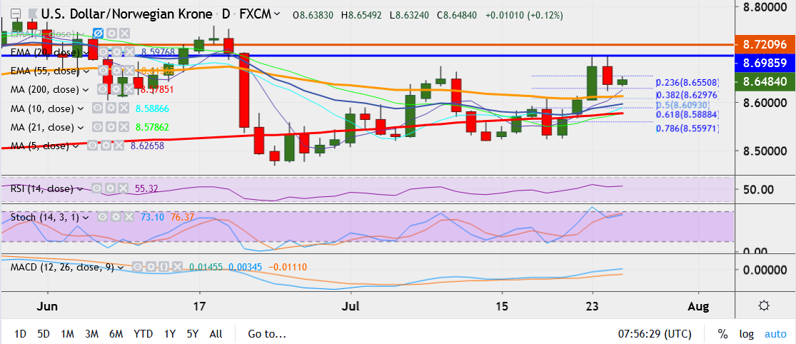 - USD/NOK trades 0.1 percent up at 8.6474, having touched a high of 8.6960 in the prior session, its highest since June 20.