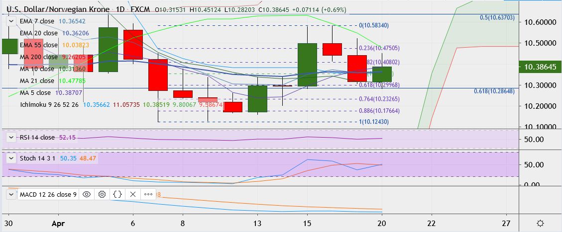 - USD/NOK trades 0.8 percent up at 10.3954, having touched a high of 10.5834 on Thursday, its highest April 6.