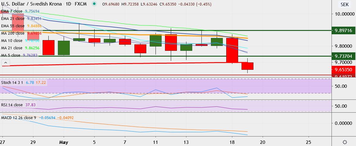 - USD/SEK trades 0.4 percent down at 9.6561, having hit a low of 9.6324 earlier, its lowest since March 16.