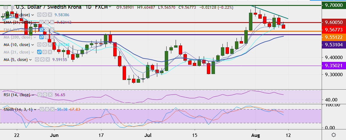 - On the lower side, support is seen at 9.5527 (July 31 Low), break below could drag it till 9.5391/ 9.5260/ 9.5164 (21-EMA).