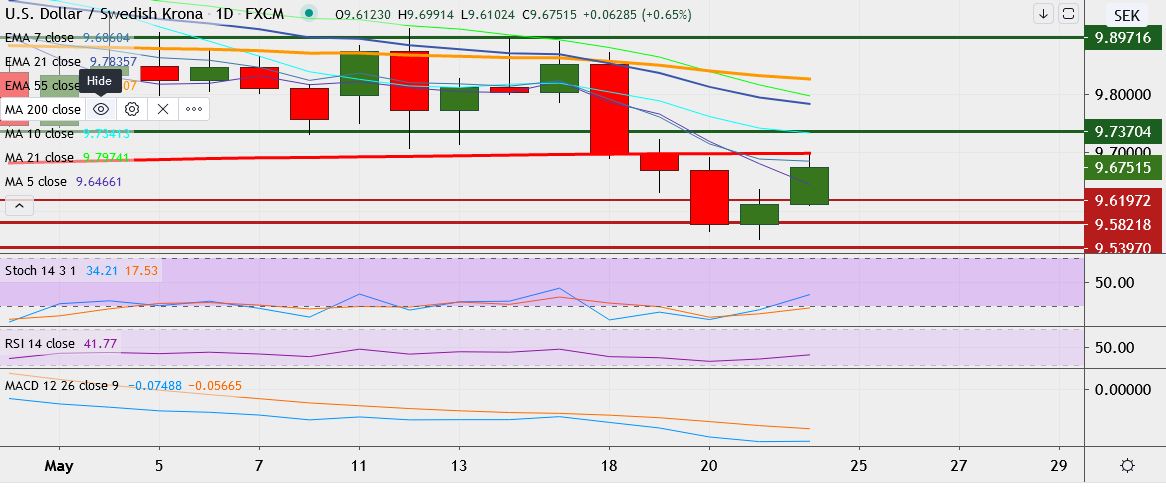 - USD/SEK trades 0.7 percent up at 9.6770, having hit a low of 9.5523 the prior session, its lowest since March 12.