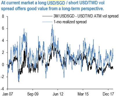 On these grounds, compared to the earlier piece, we tend to favor the shorter (3M) end of the curve for increasing the sensitivity to the realized vol differentials, thus highlighting the carry-friendly nature of the vol trade rather than its pure hedge potential. This aspect of the USDSGD – USDTWD vol spread has been a potent P/L generator since 2016.