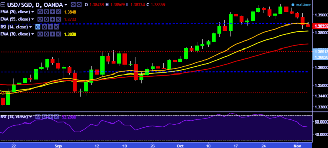 - USD/SGD is currently trading around 1.3837 marks.