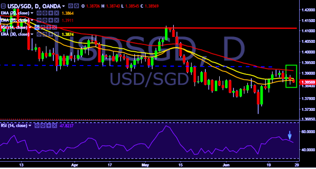 We prefer to take short position in USD/SGD around 1.3860, stop loss at 1.3892 and target of 1.3809.