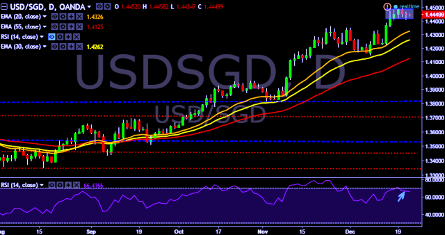 We prefer to go short on USD/SGD around 1.4452, stop loss at 1.4475 and target of 1.4410/1.4357.