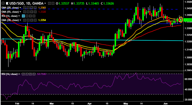 We prefer to take long position on USD/SGD only above 1.3401, stop loss 1.3330 and target of 1.3490.