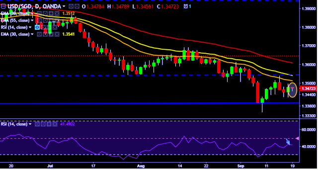 We prefer to take short position in USD/SGD only below 1.3418, stop loss 1.3538 and target of 1.3346.