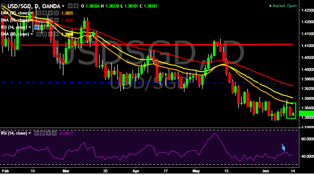 We prefer to go short on USD/SGD only below 1.3810, stop loss 1.3846 and target of 1.3776/1.3704.