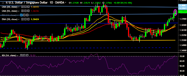 We prefer to take long position on USD/SGD around 1.3740, stop loss at 1.3690 and target of 1.3813.