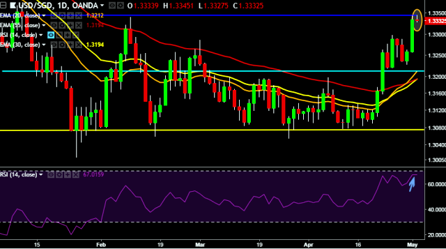 We prefer to take long position on USD/SGD around 1.3320, stop loss 1.3288 and target of 1.3370/1.3438.
