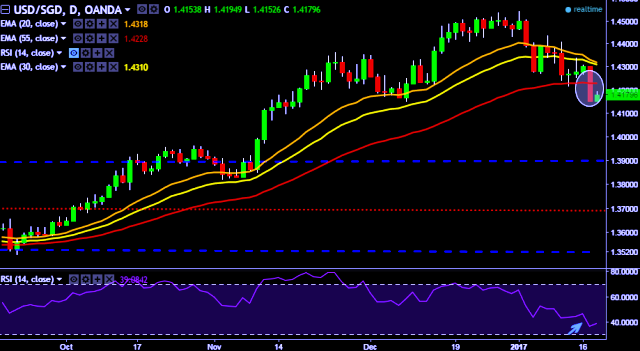 We prefer to take short position in USD/SGD around 1.4190, stop loss 1.4265 and target of 1.4046.