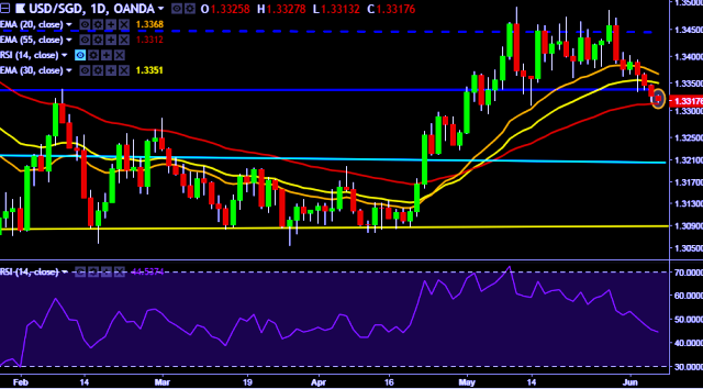 We prefer to take short position on USD/SGD only below 1.3311, stop loss 1.3350 and target of 1.3255.